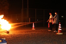 教室から、先生の指示で避難経路に従い避難した後は、実際に消火器を利用して、消火活動を行う訓練も行いました。
