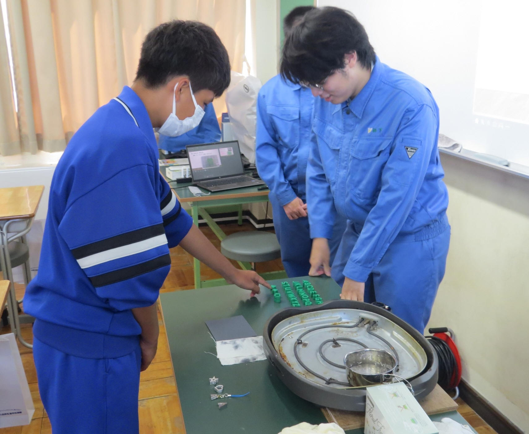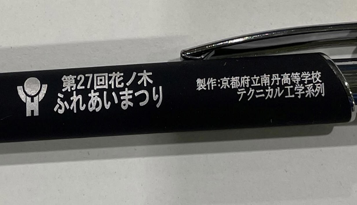 南丹市園部町にある京都府工業団地「京都新光悦村」で秋祭りが実施されました。 本校からはテクニカル工学系列3年生2名が「オリジナルボールペン」の製作に 取り組み、来場者が希望された文字をボールペンに刻印しました。 開始早々多くの注文をいただき、盛況の中、終えることができました。 |