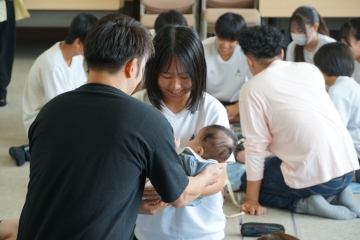 初めに、舞鶴市子育て支援基幹ひろばのスタッフの方に、舞鶴市の子育て支援施設について紹介をしていただいた後、6つのグループに分かれて赤ちゃんとふれ合ったり、お母さんやお父さんのお話を聞いたりしました。