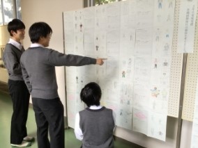 生徒達が考えた研修旅行の服装は、100号館から200号館に向かう2階渡り廊下に展示中です。