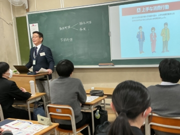 2年生の家庭基礎の授業では、2月5日(木)に2年2組と2年5組を対象として、ジブラルタ生命保険株式会社の小森篤彦様を講師にお迎えし、「将来のお金のことを考えよう」と題した金融教育セミナーを実施しました。