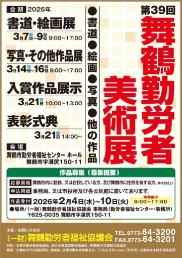 書道・絵画は3月7日(土)~9日(月)、写真・その他作品は3月14日(土)~16日(月)に勤労者福祉センターで展示されます。