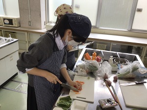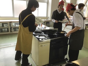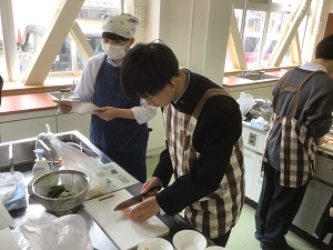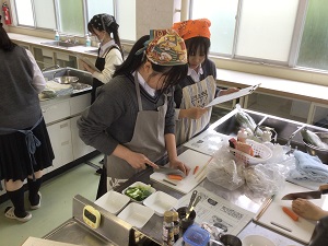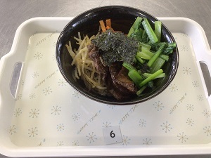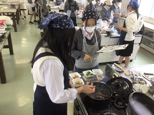 どの生徒も失敗なく、ひとりで上手に石焼風ビビンバを完成させることができました。調理や片付けの中で、環境に配慮するエコ・クッキングの実践もできました。食べ終わった生徒が「めっちゃ、うまかった!」と、空っぽになったどんぶり茶碗をもって戻ってくる様子が印象的でした。