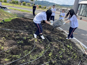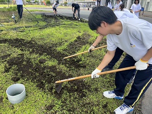 雑草がある程度とれると、今度は土壌づくりに取り組みました。培養土や堆肥をまき、養分の減った土を再生していきます(何と20袋分!)。耕すのは重労働でしたが、皆の力でやり切りました。