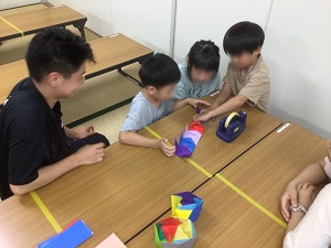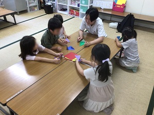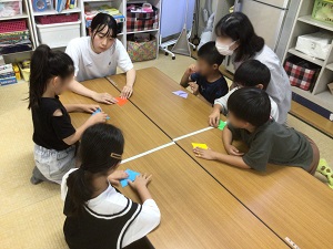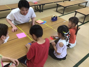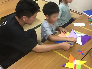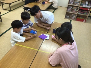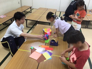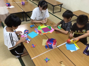 ボランティア部などの3年生生徒6名が、中筋地域児童クラブへボランティアに行き、1クラブ(12名)と2クラブ(13名)の子ども達と遊びました。今回は、それぞれが作ったパーツを組み合わせていくと、色々なサイズができる折り紙をしました。これは、みんなで遊べるものをと事前に考えて準備したものです。手裏剣づくりも組み合わせて、様々な工夫で遊びが広がり、長い時間、飽きることなくみんなで楽しむことができました。最後にカルタやトランプで盛り上がり、楽しい時間が終わりました。次は8日に別のグループが3クラブにお邪魔します。