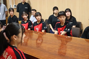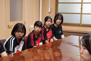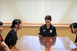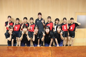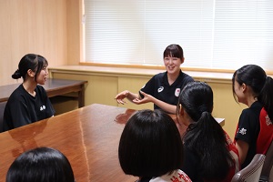 お忙しい中、本校の女子バレー部員と交流する時間を作っていただきました。パリ五輪の選手村での話や、高校時代の話、またバレーをするうえで意識していることなど一つ一つ丁寧に答えていただき、生徒達にとってたいへん貴重な経験となりました。交流会の中で、バレー部キャプテンの橋本さんが「井上選手のような選手になれるように頑張ります。」と伝えると井上選手から「私を超えるような選手になってください。」と激励の言葉をいただきました。