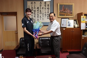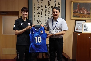 井上愛里沙選手からパリ五輪で着用していたユニフォームと日本代表メンバーとスタッフの方々のサイン入りプレートをいただきました。