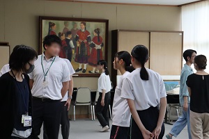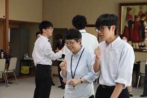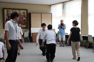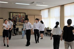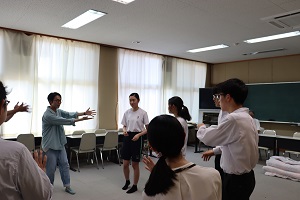講師として、即興演劇のプロ「ロクディム」様からカタヨセ ヒロシ様をお招きして、身体表現を通したコミュニケーションについて、ワークショップ形式で実践的に学びました。また、地域で活躍されている大槻様がとりまとめてくださり、市役所や社会福祉協議会の方々総勢7名にお越しいただき、演劇部員と一緒にワークショップにご参加いただきました。大人と一緒に演じる機会は少なく、高校生にとっても貴重な時間となりました。