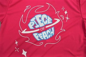 ・裏面の「piece of peach」は、英語で「楽勝」という意味のことわざ「piece of cake」からも来ています。周りに炎のイラストを付けて、「みんなで燃えあがって楽しく勝とう!」という意味を込めてデザインしました。
