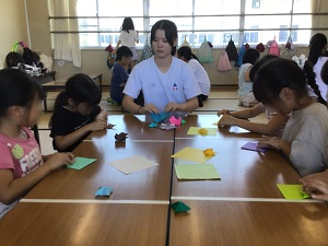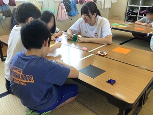 ■初めて参加しましたが、たくさんの学びがあり、とても楽しかったです。計画を立てて行きましたが、思い通りに進なかったこともありました。新聞ジャンケンを実際にやってみて、先に負けた子も楽しめるように対応できたら良かったと思いました。また新聞の折り方で勘違いをしていた子もいたので、ルールをもっと詳しく確認していたらもっとみんな楽しめたのかなと思いました。折り紙では、最初みんな違うものを折りたがったり、乗り気じゃなかったりという子もたくさんいました。そこで、「誰が1番綺麗に折れるかな?」とか、「最初はこれを作って、その次に、みんなの好きなものを作ろう。」と声かけをすることで、みんな、折り紙を楽しんでくれたので良かったと思いました。