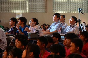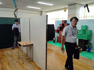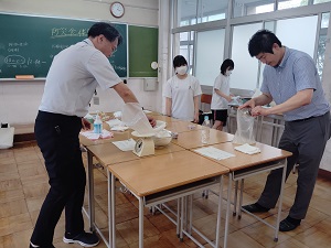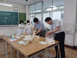 西舞鶴高校学校祭に、舞鶴市鴨田市長様が来校されました。文化祭1日目、3年生の音楽パフォーマンスの舞台を鑑賞後、本校生徒の案内で校内の展示会場を見ていただきました。料理部の「防災食体験」では、お米とお水を計ってビニール袋の口を縛り、お湯で茹でる、という一連の流れを体験していただきました。「災害時にはお米と缶詰はある場合が多いので、いい練習ですね」と仰っていただきました。