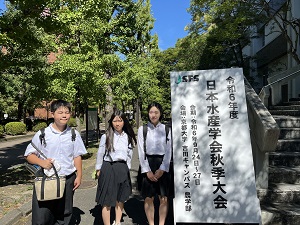 理数探究科生徒3名が、日本水産学会秋季大会に参加しました。当日は高校生発表の部で本校が毎年行っている夏期実習で蓄積されたデータをもとに、プログラミングによるデータサイエンスの手法を用いて調査地点間の底生動物について分析した結果を発表しました。