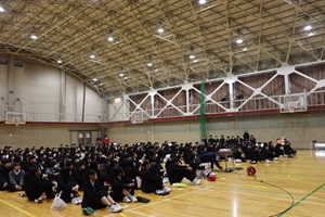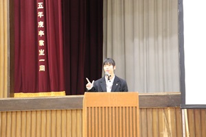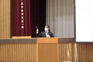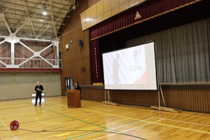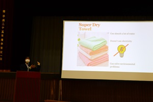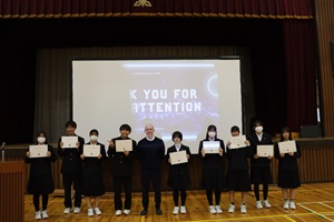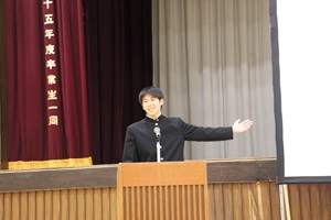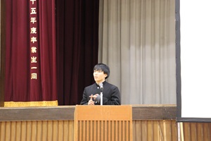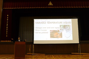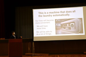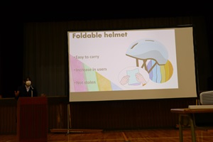 1年生の英語では、各講座・クラスから選ばれた代表者が1年生全員の前で、英語で発表する取組を行っています。今年度は、昨年度に引き続き、万博に出品するアイデアを英語で披露してもらいました。「あったらいいな」を英語で形にするのは、とても難しいことでしたが、それぞれが試行錯誤を繰り返し、素晴らしい発明品を発表してくれました。