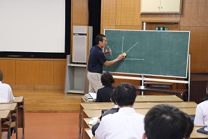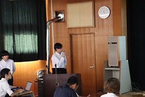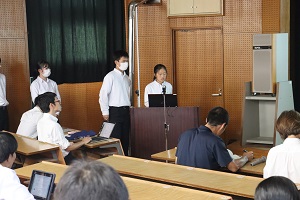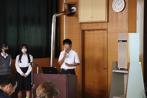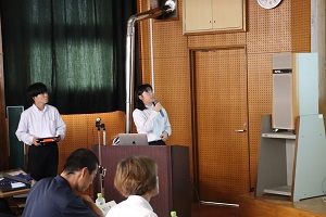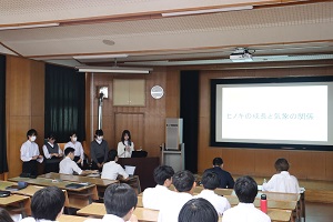 理数探究科1年生では教科横断型授業による探究活動として、毎年夏期実習「地球環境と海の生態系」のデータ分析・発表を行っています。7月の実習を経て、2学期に入ってから、理数探究基礎、探究基礎生物、情報解析、理数数学などの教科を横断して、実習(海班と森班に分かれて水質調査や生物の採取などの実習)で得られたデータについて、各グループでテーマを設定し、データ分析を行いました。(実習の様子はこちら) データの分析では過去18年間にわたり、先輩たちが積み重ねてきたデータや気象庁等のオープンデータを活用し、グループ独自の視点での考察も行いました。今回、実習・分析の集大成として、事前学習からお世話になっている京都大学フィールド科学教育研究センターの中西先生、鈴木先生をお招きして口頭発表会を行いました。