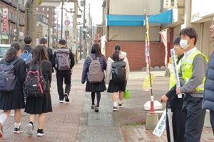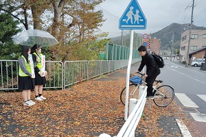 月に1度の交通立ち番をおこないました。京都府知事から委嘱された1年生の自転車安全利用推進員のデビューです。登校時間に各場所に立ち、交通安全を呼びかけました。