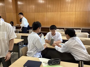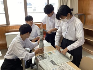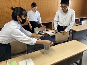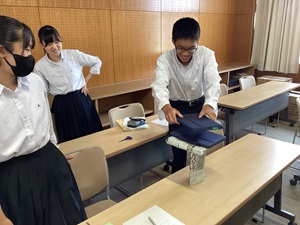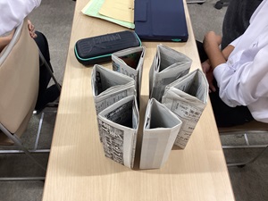 理数探究科1年生では、週に1回ALTの先生の授業を行っています。トピックは毎回興味深いものばかり!生徒たち一押しのプロジェクトは、耐震性を考えるため、新聞紙とセロテープ2本を使って、iPadを支えられる柱を作ろうというものでした。最初に仮説を立て、レポートに英語で書き込みます。イラストも駆使して考えを深めたら、いざ実践!ハリソン先生の質問に答えながら制限時間内に作れるかとドキドキしているようでしたが、大盛り上がり。ほかのグループはどんなものにしているのか、など最後まで興味津々でした。