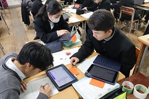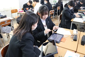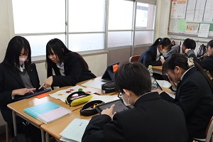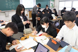 | 2時間目は、持ち帰った植物の同定です。その植物の特徴をよく読み取って、Webサイトにある検索システムを使って調べていきます。これが、なかなか難しい。特徴から絞り込んでも、「該当なし」と出たり、逆に、候補が多すぎて決め手に欠けたりと。でも、班のみんなで相談したり、意見を出しあうことで、なんとか採集した標本の同定にこぎつけました。それが、正しいかどうかは、ご愛敬ということで。ただ、こうした地道な生物種の同定調査を経験し、「理科」という分野に少しでも興味が膨らめばいいなと願っています。 |