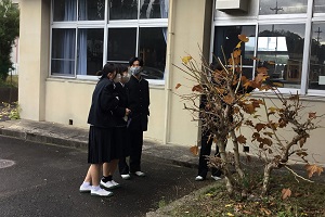その場所に生育する植物の様子について学びます。そこで、「校内にどんな植物があるのか、調べてみましょう」というテーマで、フィールドワークを行いました。1時間目は、校内にある植物の標本(葉)とその姿の写真を採集。2時間目は、その情報をもとに採取した植物の同定を行いました。1チーム3~5人の班をつくり、班での活動となります。どの木にしようかなぁ、この野草にしようかなぁ、班のみんなで相談して目的の標本を選びます。普段見慣れている風景ではありますが、改めて観察してみると、校内にもこれだけたくさんの種類の植物が植栽されていたり、自生していたりするのだと気づきます。 |