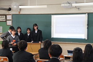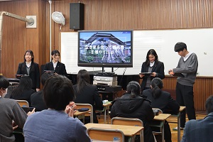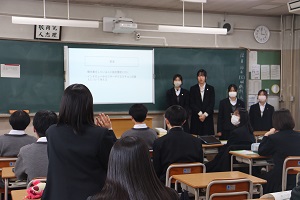 1年生の「はばたき」(総合的な探究の時間)では、舞鶴市の強みと課題を整理し、市民の視点で地域活性化の在り方を探究しています。中間発表会では、現在の進捗状況をスライド資料で示し、今後の展望について発表しました。