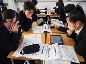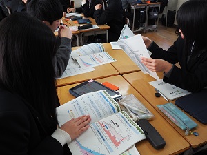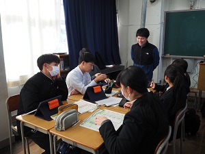 また、後半にはグループで、財務大臣になったつもりで予算案を立ててみるという活動も行っていました。生徒は「実際に予算を考える機会がないので、楽しい。」や「国債を増やさないようにするのは、難しかった。」など、グループワークを通して予算を考える難しさを学ぶことができました。