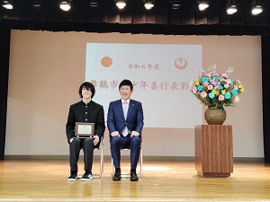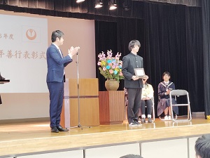 表彰式では、ボランティア部代表の高橋さんが舞鶴市長より表彰されました。