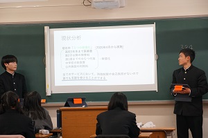 5・6限に2年「はばたき」(総合的な探究の時間)最終発表会を実施し、自らの興味・関心に基づいて探究活動を行ってきた全50グループが成果を共有しました。京都府立大学・窪田先生に助言・指導いただいた「新しい観光ルートの開発」、日常のなかで感じていた疑問や課題の解決をめざした「災害時にペットはどうなるのか」「廃棄を活用した取組」「世界の子どもたちの現状と医療のあり方」など、多様な発表を聞くことで生徒たちは新たな気付きを得ることができたようでした。発表に際しては、4名の方をゲストとしてお迎えし、講評・感想をいただきました。