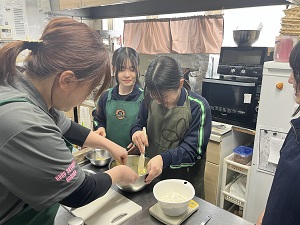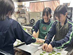 「舞鶴の特産品を通して観光客を増やす」をテーマに探究を行ったグループ4名は、万願寺甘とうのクッキーなど4種類を考案しました。今回発売するのは、万願寺甘とうのクッキーを季節に合わせアレンジした抹茶クッキーになります。数量限定での販売になりますが、ぜひお立ち寄りください。お待ちしております。