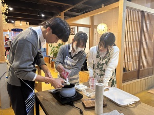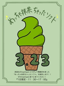 このグループは「食べ物の観点から舞鶴の魅力をより多くの人に知ってもらい、移住者や観光客を増やすには」をテーマに探究活動を行っています。今回は舞鶴茶を使った新しいスイーツを販売します。商品名は「めっちゃ抹茶ちゃったソフト」1日限定で無くなり次第終了です!