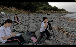 昼間は島内の調査区画で調査の準備を行ったり、島内の昆虫や植物を観察したりしながら過ごしました。そして、夕方になるとオオミズナギドリが帰島前に冠島の周囲を反時計回りに周回する「鳥周り」と呼ばれる現象の調査を行いました。生徒たちは、望遠鏡を用いて個体数をカウントしました。