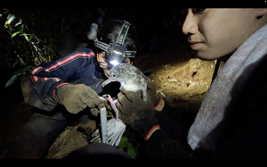 夜になると冠島調査研究会の標識調査の補助を行いました。区画内にいるオオミズナギドリを手で捕まえ、足にリングを付けたり、リングの文字を読み取り記録したりしました。これらのデータは標識調査の管理を行っている山階鳥類研究所で貴重なデータとして今後保管されていきます。