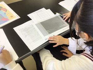 モアレと呼ばれる事象を実験を通して体験しました。西川先生が作成されたワークシートを動かすと歯車が動いたり、写真が見えると生徒からは驚きの声が上がりました。