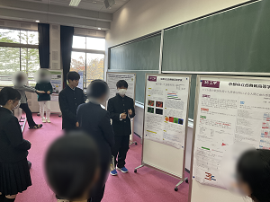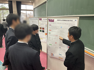 当日は約80名の高校生が課題研究の取組状況をポスター発表の形式で報告しました。各班で行っている専門的な研究内容について、他校でも同じような取組をしていたり、全く新しい視点でアドバイスをいただいたりすることができて、大きな刺激を受けた生徒が多かったようです。また、会場である福知山公立大学の先生方、学生さんにはポスター発表と講評をしていただきました。さらに舞鶴市、福知山市、宮津市のエネルギーや環境に関するポスターも各市役所より出展していただき、様々な視点で科学について学ぶ機会となりました。