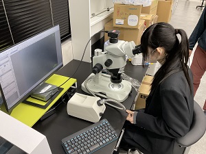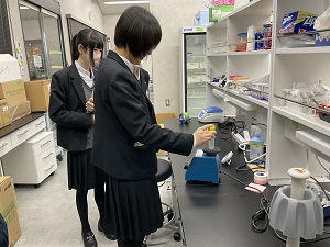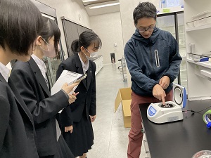 今回は海洋系や生物系に興味のある生徒3名での訪問で、少人数を活かして様々な質問に答えていただいたり、普段は立ち入れない施設に入らせていただいたりしました。また、大学生が行う化学実験を見学させていただき、学生さんとお話をさせていただく機会も設けていただきました。西辻先生からは、福井県立大学のことや、海洋系の学問についてのお話、先生自身の研究のお話など多岐にわたる内容について、楽しく教えていただきました。