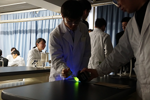 講義では「蛍光」について、化学的にどのような現象なのか、身の回りでどのように活用されているのか、などをお話しいただきました。また、蛍光ペンや郵便物などに紫外線を照射して実際に蛍光を観察しました。
