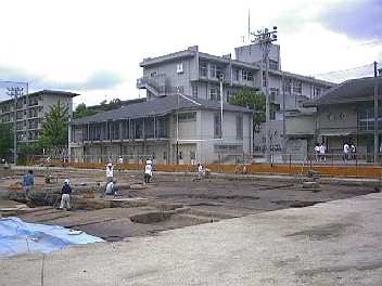 1 遺跡名称 平安京右京一条三坊九・十町遺跡 2 調査主体 (財)京都府埋蔵文化財調査研究センター 3 調査期間 平成10年10月から平成11年8月 4 調査面積 2,700u 今回の調査は、府立山城高等学校の校舎改築に先立ち、建設予定地であるグランド内で実施されたもので、平安京の条坊では、右京一条三坊九町の南西部と十町の北西部に該当し、調査地は、昭和54年度の発掘調査において、平安京跡右京一条三坊九町遺跡と呼ばれる大規模な邸宅跡(府史跡として保存)が検出され、注目された所です。